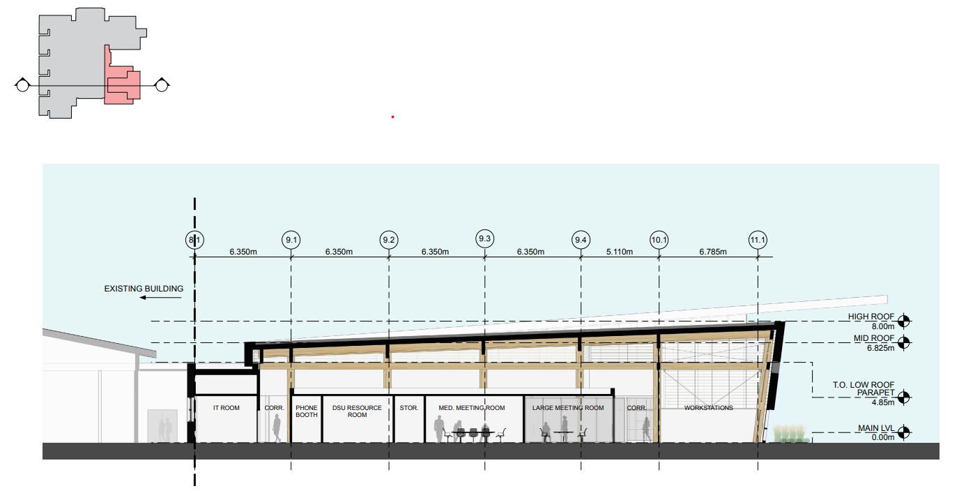 SAMU is constructing a new building on the downtown Edmonton campus to serve its student population better: it should showcase student life to the city, provide space to both study and socialize, and facilitate programming and resources that currently cannot be accommodated on the campus. The building’s architectural program, includes study space, social space, a food service area, a large event space, club facilities and a large administrative office suite. The site, at the heart of the campus, is very long and narrow, measuring 13 meters wide by 130 meters long. Its centrality, in the middle of a sequence of 11 existing campus buildings, puts it at a high-prole location within the city, and the campus. The three-storey triple-glazed west curtain wall hangs like a wavy curtain to reveal student life inside the building and simultaneously oer playful and ever-changing reections o the exterior glass. All through the building, one can experience a sense of openness and connection to adjacent spaces.